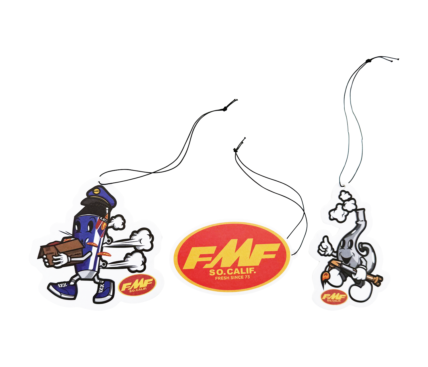Hang em in your car or where ever it's a bit stinky. This pack comes with three fun designs to show off your love of FMF pipes