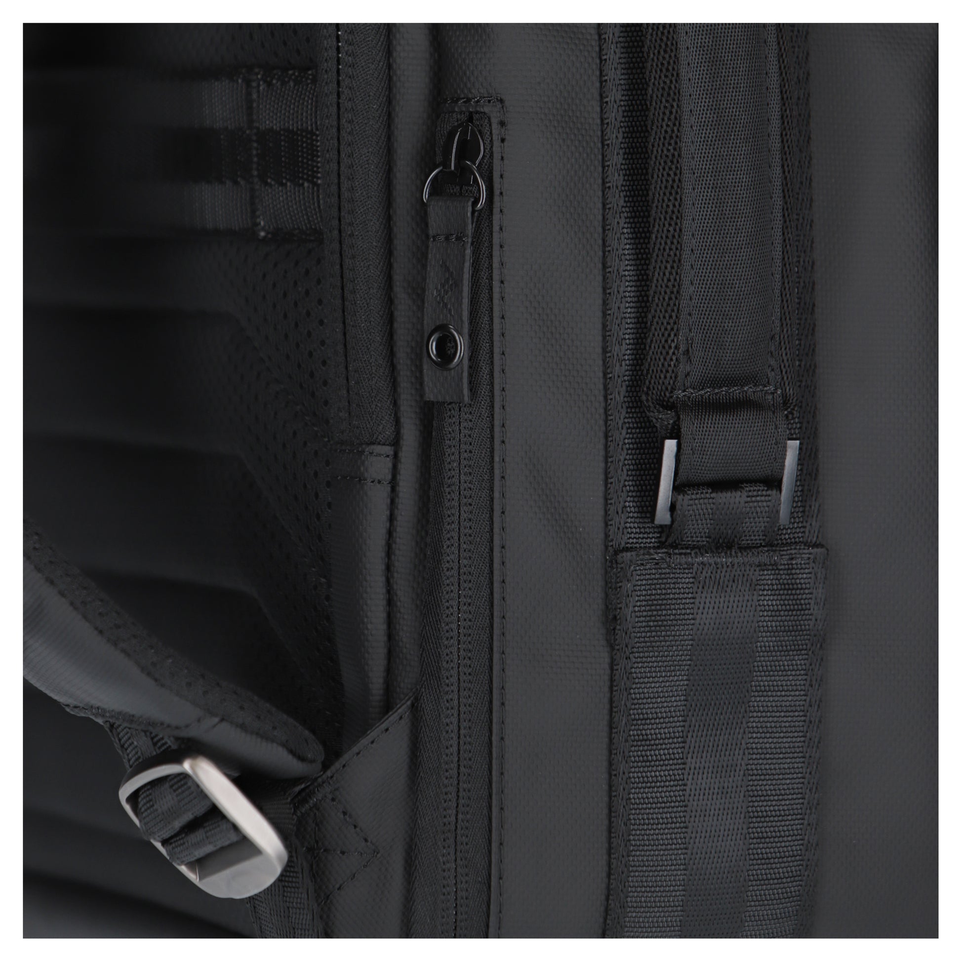 The main section provides ample storage space with a zippered mesh pocket and two elasticated side pockets. Its laptop compartment features a circumference zipper for security and contains two padded internal pockets for a laptop and tablet, document storage, and tech pockets suspended from the bottom of the bag, all with extra padding for added protection.