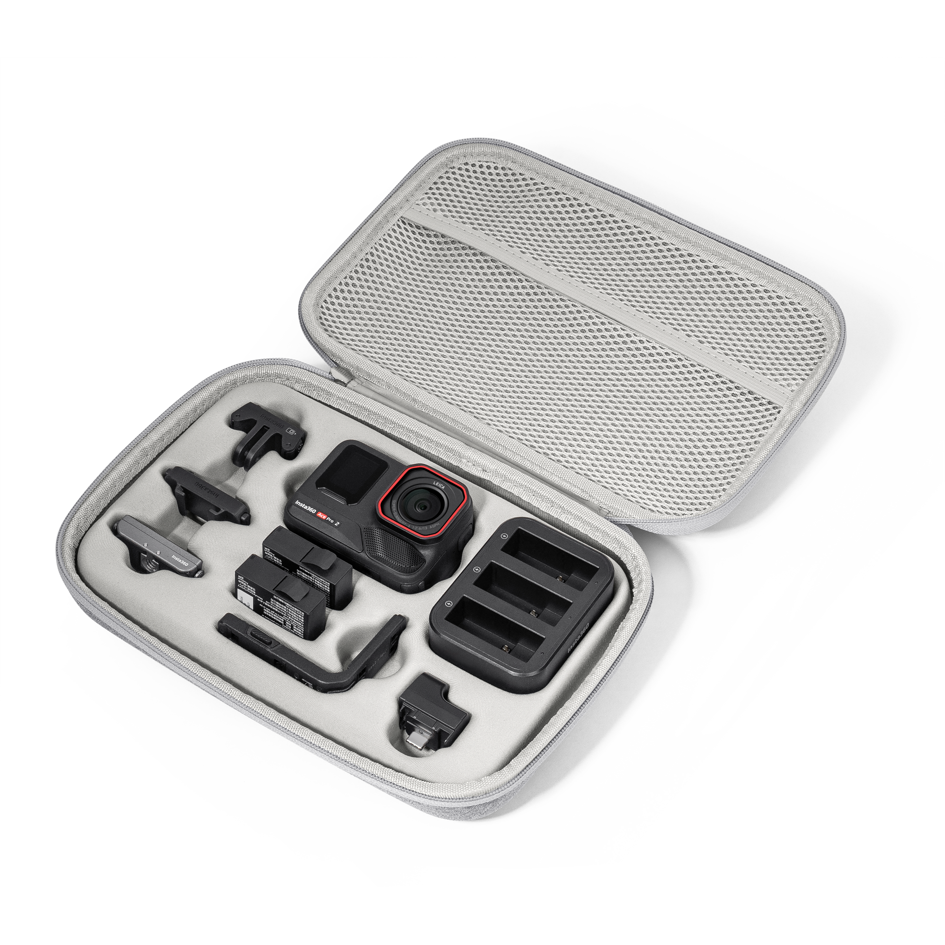 Holds your Insta360 Ace Pro 2/Ace Pro/Ace, two batteries, Cold Shoe, Quick Release Mount, Fast Charge Hub, Mic Adapter, and your accessories.