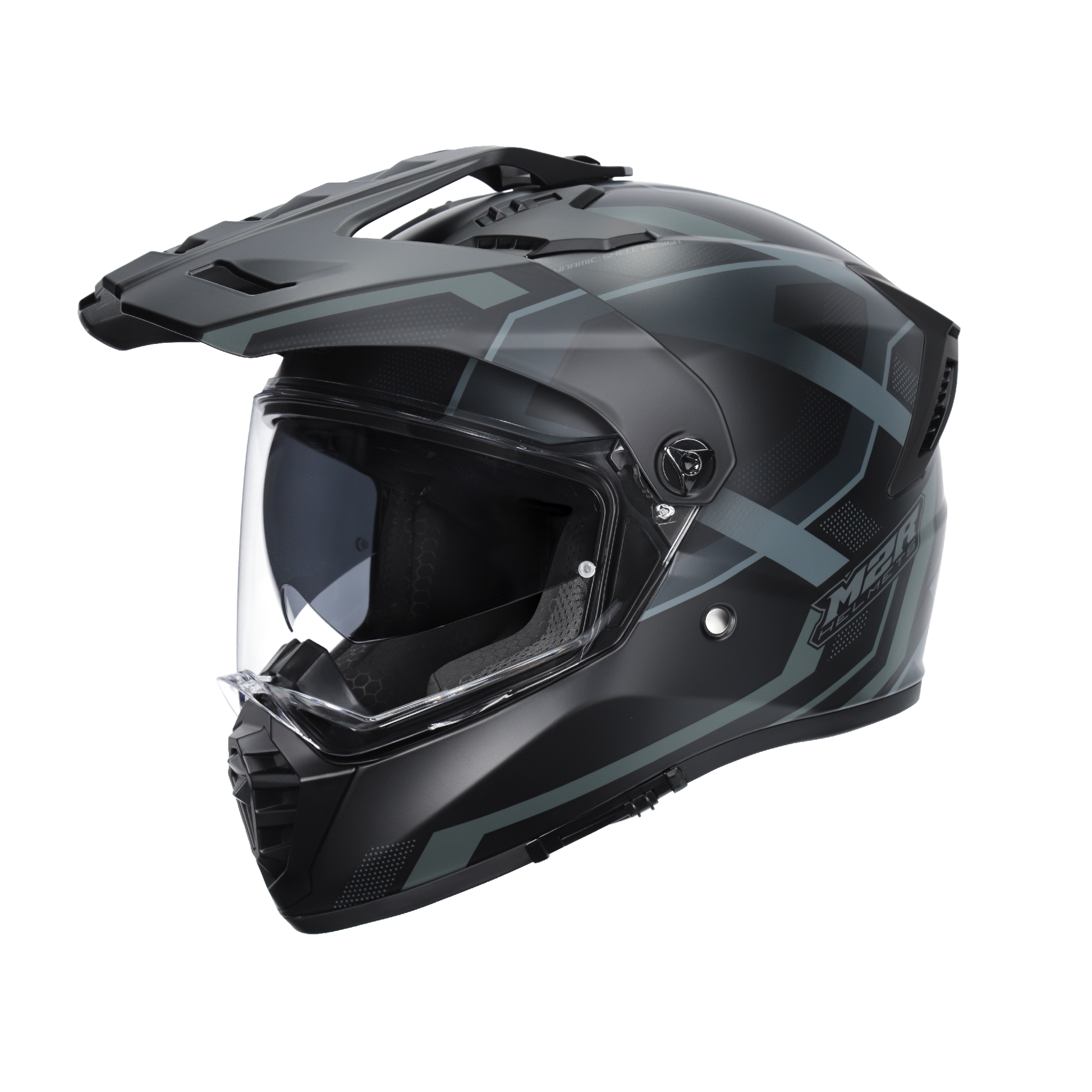 Equipped with a removable internal drop-down sun visor and an external UV-protected visor offering a wide field of view, the helmet also accommodates optional tinted visors and a clear inner visor for off-road riding. Its large eye port fits goggles seamlessly, complemented by a removable fluted peak designed to reduce wind resistance when attached.