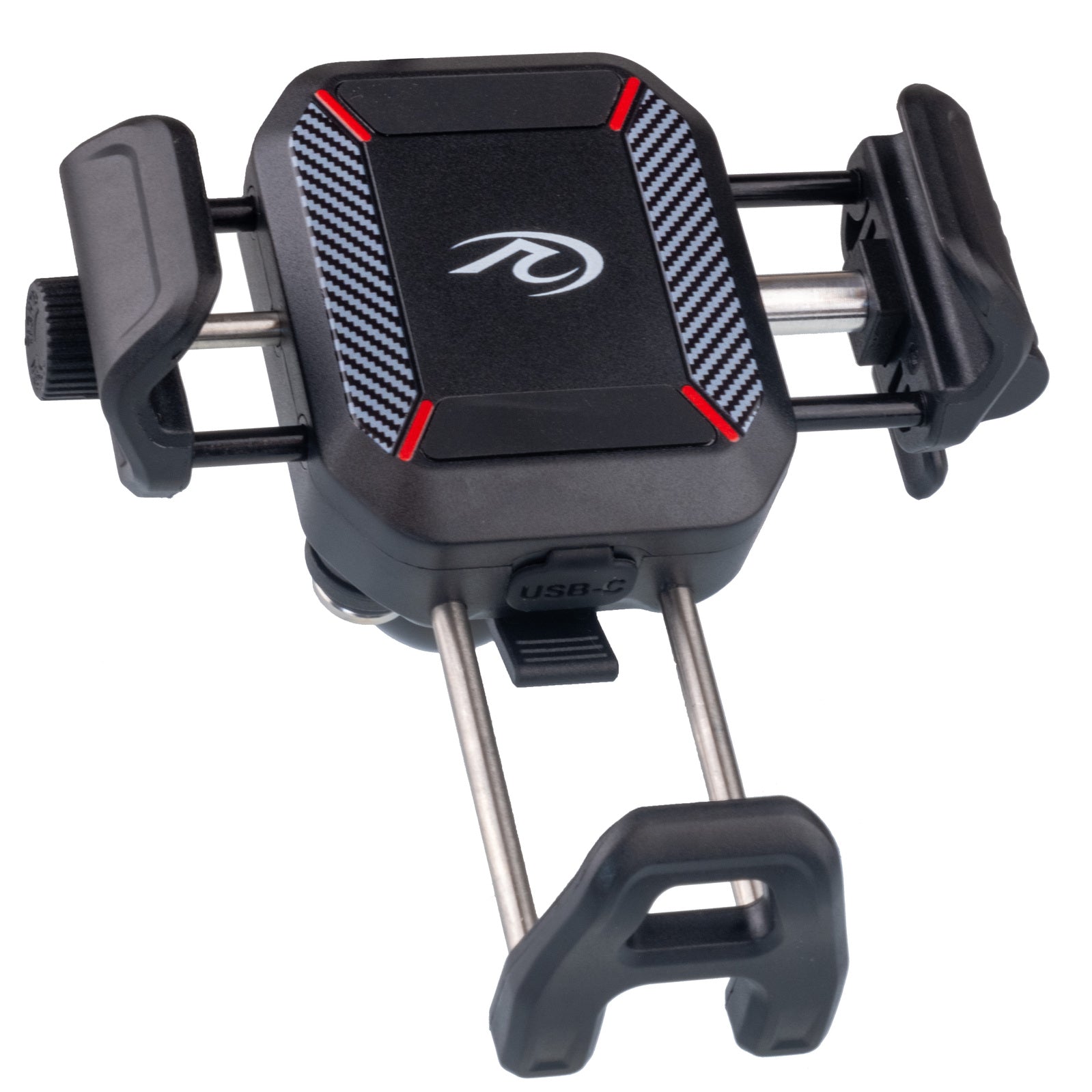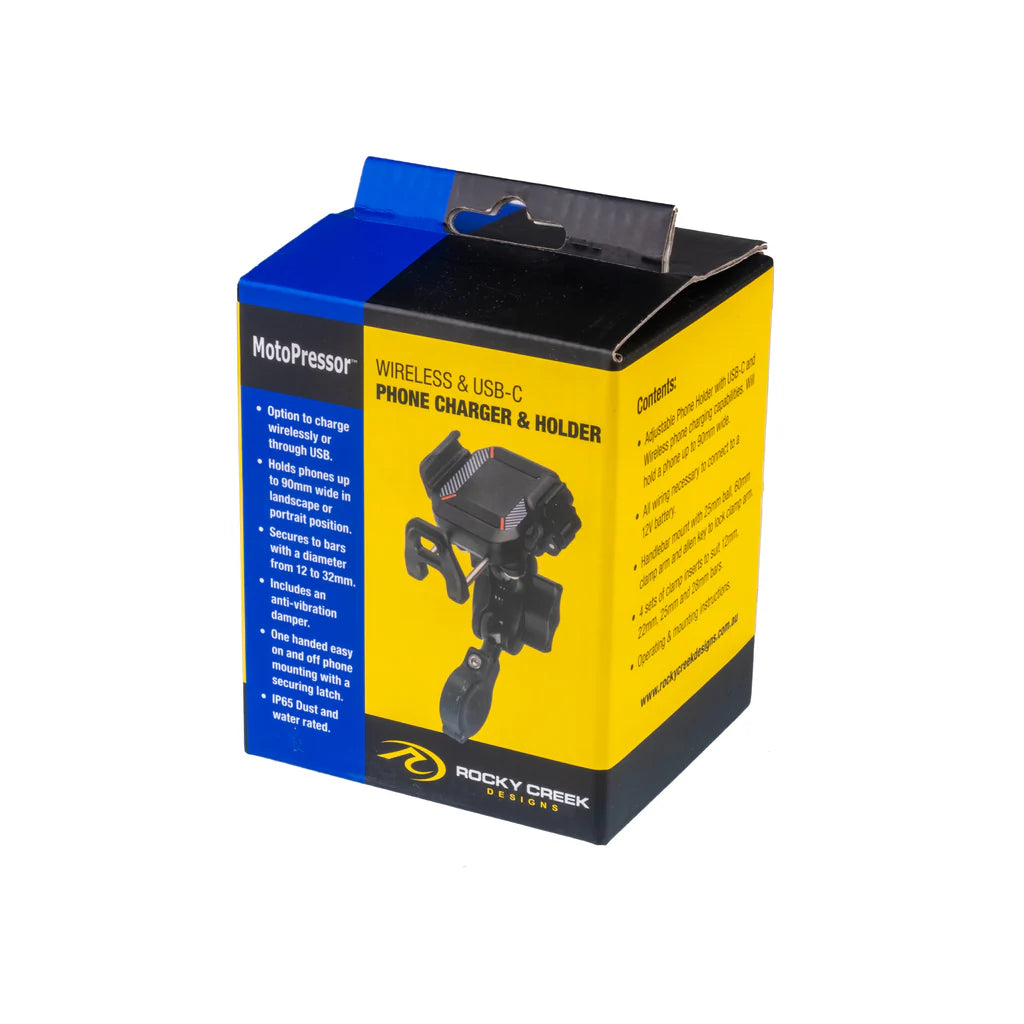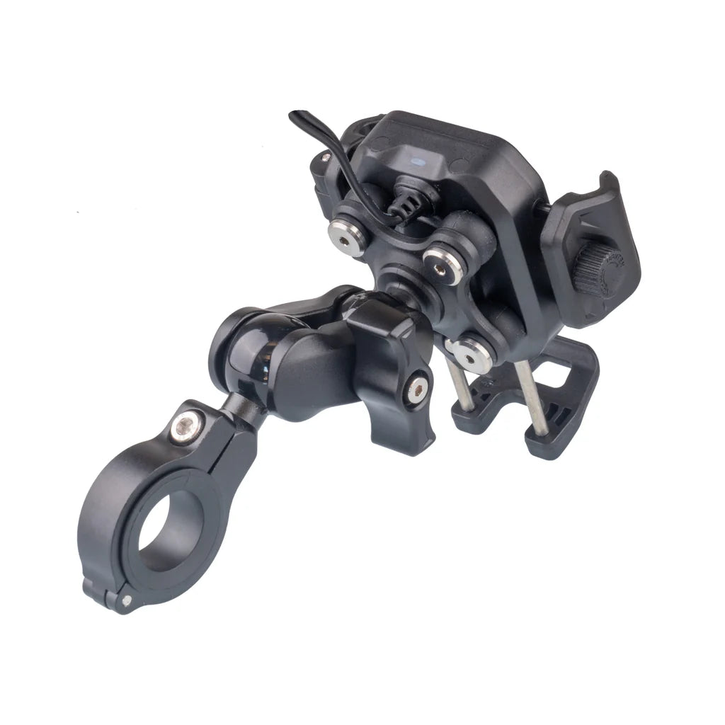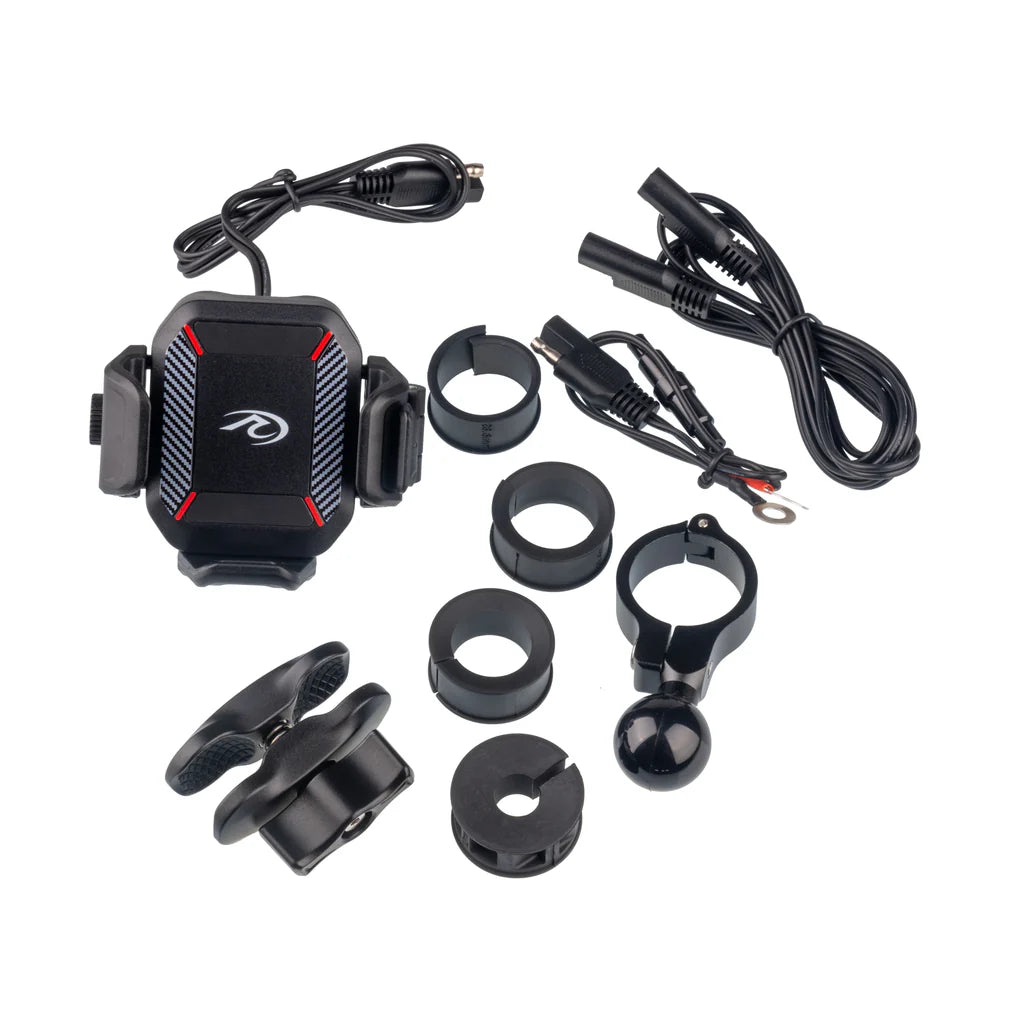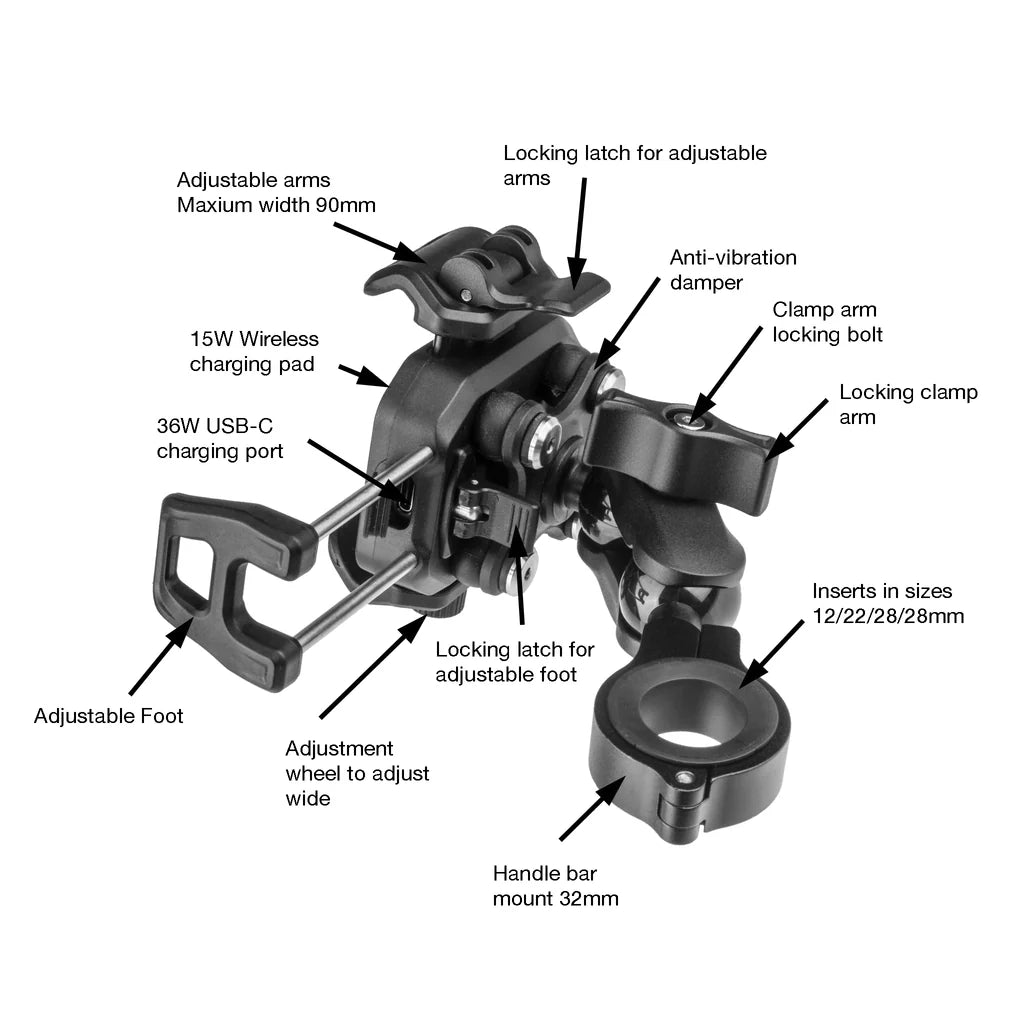 This phone holder & charger will charge both wirelessly and/or through a USB-C port. It will securely hold a phone up to 90mm wide and comes with all wiring necessary to connect to your motorcycle battery. There is a 25mm handlebar ball mount with a 60mm clamp arm which can be securely locked in place. The bar clamp will open to 33mm and there are 12, 22, 25 and 28mm clamp inserts. The unit has a built-in anti-vibration damper and is IP65 rated. Simple one handed on and off phone mounting, with a securing latch.