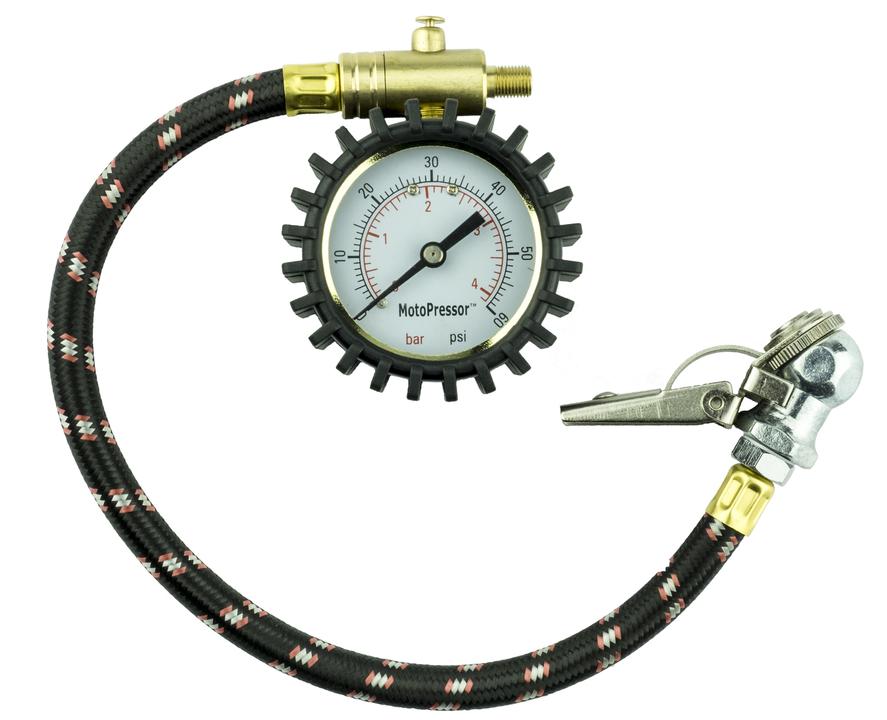 We all know what a pain Petrol Station gauges are. Most are woefully inaccurate and impossible to get onto a motorcycle valve stem. To use the MotoPressor Tyre Gauge with Petrol Station gauge, simply attach the MotoPressor Tyre Gauge to your valve stem, attach the petrol station chuck to the inline fitting on the gauge and get an instant and accurate reading in PSI or KPA.