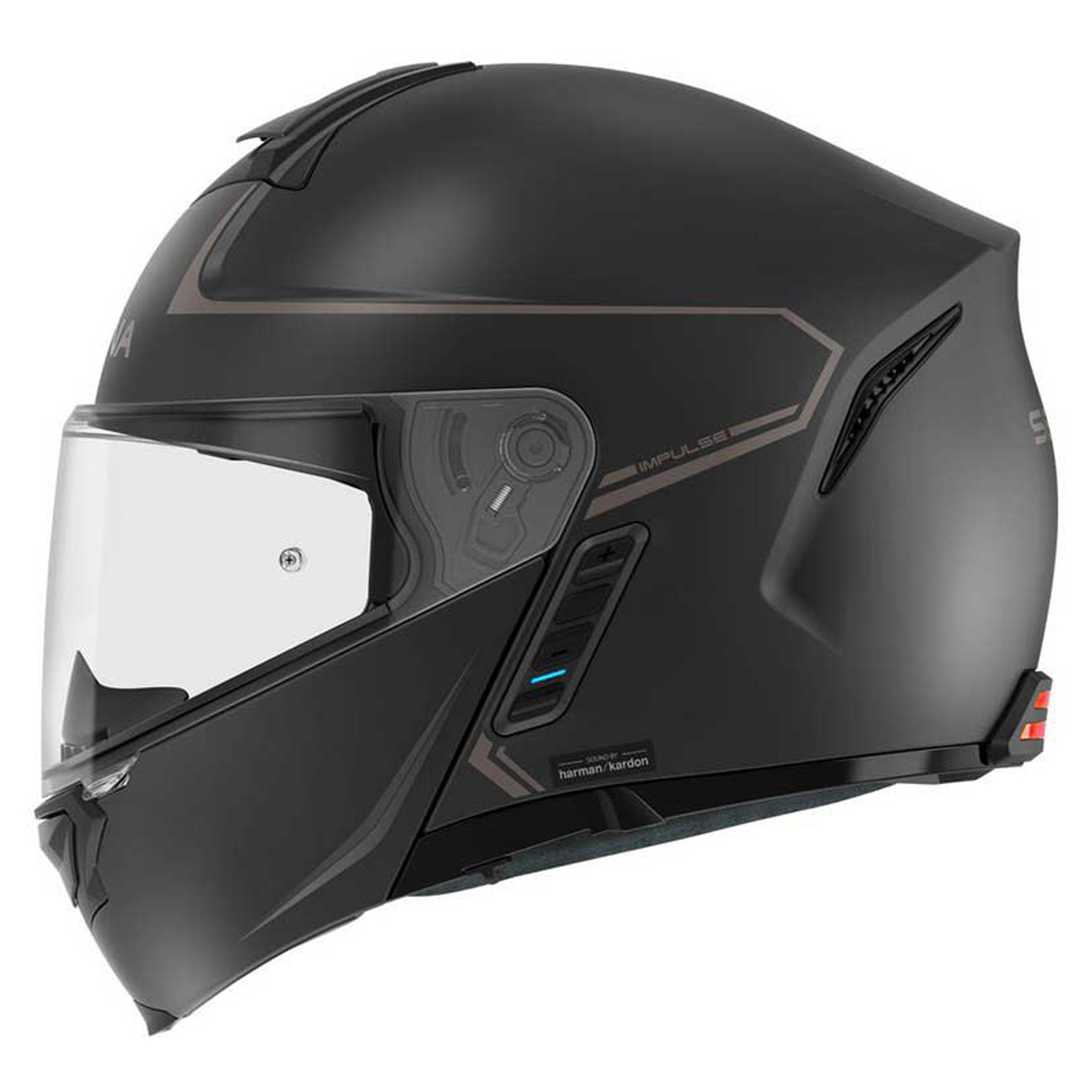 The Sena Impulse is a modular smart helmet featuring Sena' industry-leading Mesh Intercom and Bluetooth Intercom technology (with equivalent functionality to the SENA 50S) plus premium speakers and microphone by the audio experts at Harman Kardon. The impulse features both Mesh and Bluetooth Intercom platforms, allowing users to connect with any Sena headset for rider-to-rider communication. For a private group conversation, Impulse offers Group Mesh Intercom mode. Open Mesh Intercom offers a simple, single push of a button to click-to-connect to the Mesh intercom network.