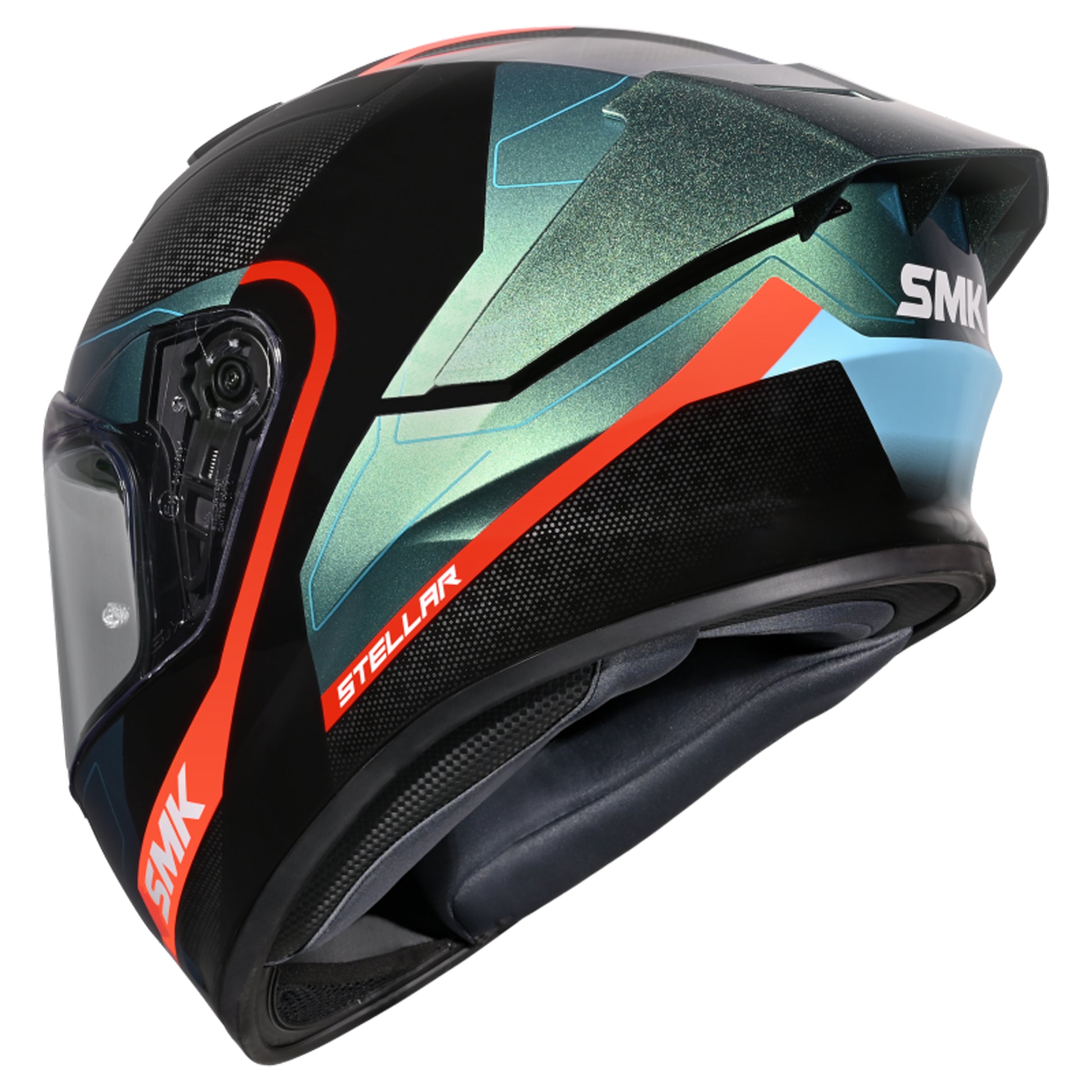 The SMK Stellar is a Full-face helmet, made using the latest generation materials for maximum safety and style. It is characterized by bold contours and a strong and aggressive design. A light weight and superior fit gives riders great comfort even during long durations of use. The extra wide, one touch replaceable visor, provides an excellent view of the road. An efficient ventilation system, with advanced channelled air intakes on the chin-guard and top of the helmet provides maximum comfort on long journeys and all weather conditions. SMK Stellar comes with an exciting range of features like Wind Stops and Pinlock 70 ready visor.